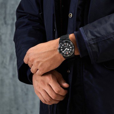 La montre est 20 ATM. Cela signifie que la montre est adaptée à la plongée. La montre est livrée avec la Swiss Military 3+2.