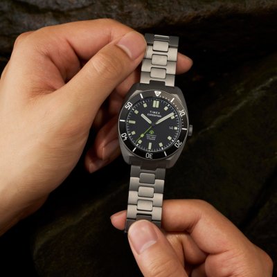 Cette montre Timex a un boîtier Titane 41 mm en diamètre et est équipée d'un bracelet Titane. Le boîtier contient un mouvement Timex et la montre est dotée d'un cristal Saphire..