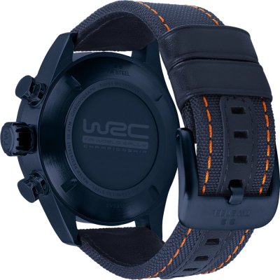 Ce chronographe en édition spéciale est réalisé dans les couleurs bleu et orange du championnat du monde des rallyes et arbore le logo WRC sur le fond du boîtier.