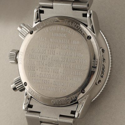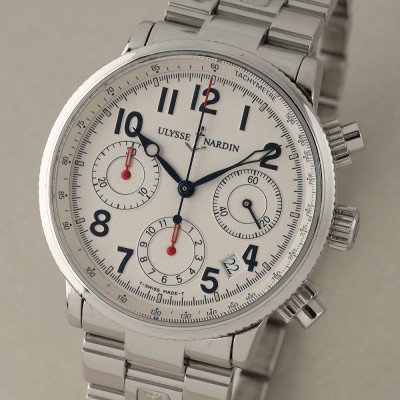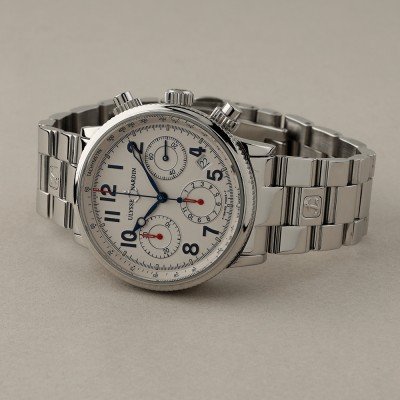 Cette montre Ulysse Nardin a un boîtier Inox 37 mm en diamètre et est équipée d'un bracelet Inox. Le boîtier contient un mouvement ETA et la montre est dotée d'un cristal Saphire..