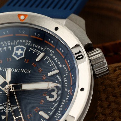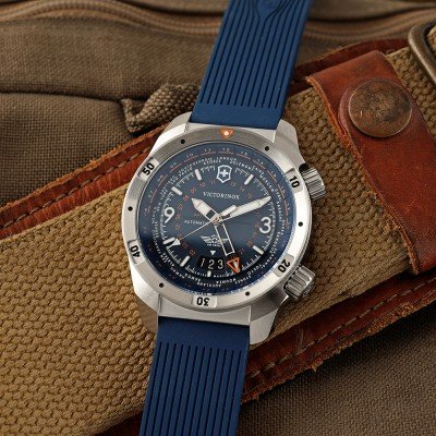 Cette montre Victorinox a un boîtier Inox 43 mm en diamètre et est équipée d'un bracelet caoutchouc. Le boîtier contient un mouvement Sellita et la montre est dotée d'un cristal Saphir antireflet unique..