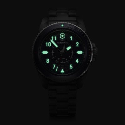 Cette montre Victorinox a un boîtier Inox 43 mm en diamètre et est équipée d'un bracelet Inox. Le boîtier contient un mouvement Ronda et la montre est dotée d'un cristal Saphire..