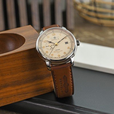Cette montre Zeppelin a un boîtier Inox 40 mm en diamètre et est équipée d'un bracelet cuir. Le boîtier contient un mouvement Miyota et la montre est dotée d'un cristal K1 Minéral..